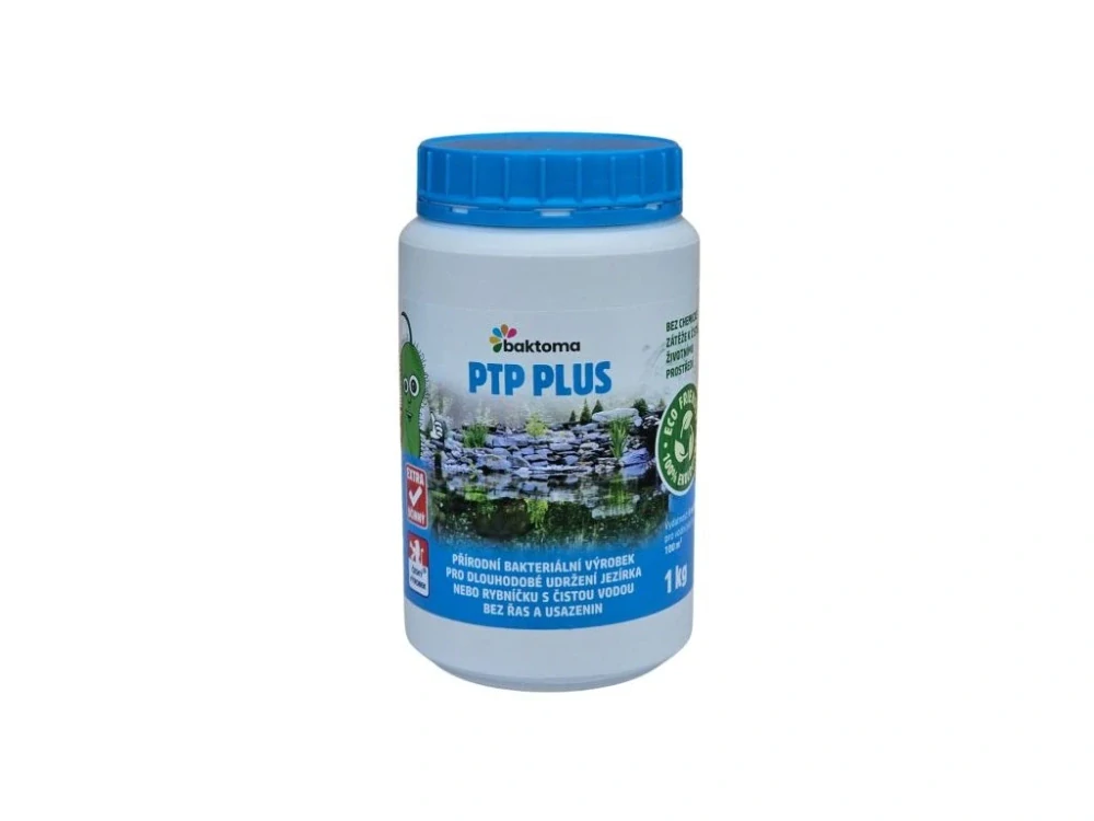 Přípravek PTP PLUS je směs bakteriálních spór, enzymů a živin nutných pro činnost mikroorganismů. Účelem používání prostředku PTP Plus je odstranění organického bahna, sinic a zvýšení obsahu kyslíku ve vodním sloupci ve Vašem jezírku, rybníku nebo jezeře. Působením přípravku je rozklad a odstranění organických usazenin a organického bahna na dně i ve vodním sloupci pomocí vysoce mobilních přírodních nemodifikovaných aerobních bakterií a fakultativních anaerobních bakterií s pozitivní chemotaxou (mohou rozpoznat typ chemického odpadu a plavat k němu). Zároveň dochází k výraznému snížení fosforu a chlorofylu A, který je měřítkem koncentrace řas (likviduje látky podporující růst řas a tvorbu sinic), fosfátů a zakalení ve vodním sloupci. Odstranění fosfátů má za následek odstranění sinic. Dochází ke zvyšení obsah kyslíku. Při pravidelném používání přípravku PTP PLUS dochází k reprodukci bakterií, což má za následek nepřetržité čištění jezírka, jezera a rybníku. Dochází k odstranění oragnického bahna a není třeba drahé vybagrování a odvoz bahna ze dna rybníku.
